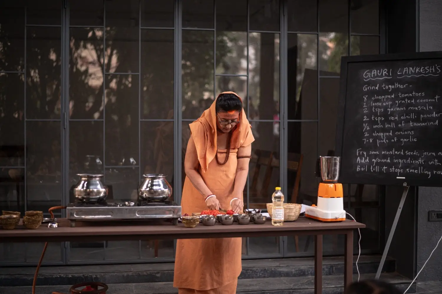 Pushpamala’s live cooking performance, Gauri Lankesh’s Urgent Saaru, is an act of remembrance for the artist’s close friend, journalist Gauri Lankesh, who was assassinated in 2017 for her political views. Gauri was the artist’s neighbour and a good cook who gave the artist several recipes. Urgent Saaru— which means a quick curry that is dished up for unexpected guests – was probably invented by Gauri’s mother. The performance takes off from popular TV cooking programmes while also referring to the Hindu prasada and the Christian Eucharist, where red wine and bread representing the blood and flesh of Christ are given out in remembrance of his sacrifice. This particular recipe was specifically chosen for the performance as the tomato coconut curry is deep red in colour, the colour of blood, and because the times are…urgent.